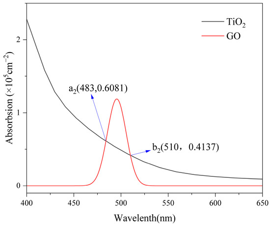 The photocatalytic performance of titanium dioxide (TiO2) is influenced by its structural properties. Simulation was performed through VASP software. TiO2 shows a characteristic absorption edge at approximately 380 nm (Figure 3), indicating its primary activity within the UV region, which aligns with its intrinsic bandgap of about 3.2 eV [41]. The N-TiO2 sample shows a notable red-shift in the absorption edge, extending significantly into the visible region, with enhanced absorption at longer wavelengths beyond 400 nm (Figure 3). This enhancement can be attributed to the introduction of nitrogen dopant states within the TiO2 bandgap, which facilitates transitions at lower energy levels and hence visible light absorption [42]. GO exhibits pronounced absorption in the visible range, with peaks at around 483 nm and 510 nm (Figure 4), suggesting that GO has substantial visible light harvesting ability due to its sp2 hybridized carbon network, which facilitates π-π* transitions [43].