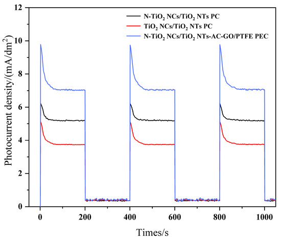 Transient photocurrent responses of TiO2 NCs/TiO2 NTs, N-TiO2 NCs/TiO2 NTs, and N-TiO2 NCs/TiO2 NTs-AC-GO/PTFE.