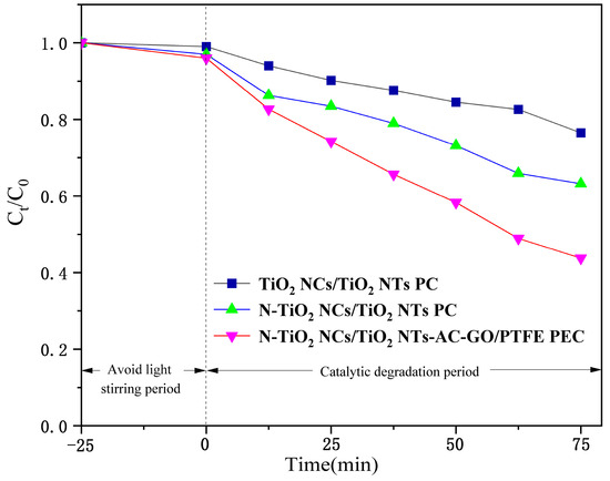 In order to evaluate the degradation efficiency of diclofenac (DCF) under photocatalysis and photoelectrocatalysis, the relative concentration changes (Ct/C0) of DCF over time were measured for different catalysts, as shown in Figure 8. The experiments were conducted under simulated sunlight with Xenon lamp. The pH was 7.6, following an initial dark stirring period to establish adsorption–desorption equilibrium; the catalytic degradation period commenced at t = 0. The N-TiO2 NCs/TiO2 NTs-AC-GO/PTFE PEC system exhibited the most rapid degradation, with DCF concentrations decreasing by approximately 50% within the first 50 min, reaching Ct/C0 ≈ 0.5. At 75 min, the degradation rate of DFC was about 58%, close to the 58.4% reported in previous studies [21], and faster than the 42.5% degradation observed in 105 min [53]. In contrast, N-TiO2 NCs/TiO2 NTs PC and TiO2 NCs/TiO2 NTs PC displayed slower degradation rates, achieving only about 30% and 15% reductions, respectively, over the same period.