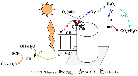 Based on the systematic analyses, the enhanced photocatalytic (PC) mechanism of the N-TiO2 NCs/TiO2 NTs-AC-GO/PTFE photoelectrode is proposed and illustrated in Figure 9. Pristine TiO2 NTs exhibit relatively low PC efficiency due to limited visible light absorption and the high recombination rate of photogenerated charge carriers. However, with the co-modification by nitrogen doping (N-TiO2 NCs) and AC-GO, significant improvements are achieved in both visible light absorption and charge separation.
