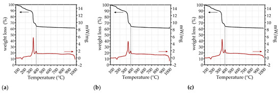 TG/DSC curves of the dried binder-containing powders: (a) HYB-PEI; (b) HYB-HPMC; (c) HYB-MC.