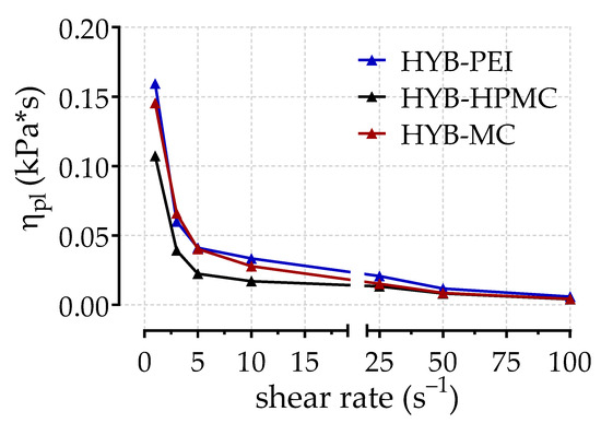 In particular, the HYB-PEI sample displayed the highest yield stress, resulting about 20 and 40 Pa higher than HYB-MC and HYB-HPMC, respectively. This observed behaviour for the used ink pastes, which is typical for pseudo-plastics (or shear-thinning fluids), was also analysed using the Bingham equation (Equation (1)) over the linear high-shear region of τ versus γ curves: