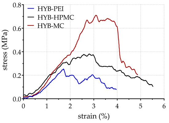 While the HYB-PEI sample exhibited a compression modulus as low as 0.125 MPa, the HYB-MC sample was characterized by the highest value (0.201 MPa), also mirroring the highest value of compression strength (σmax, 0.73 MPa).