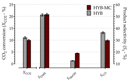Under the adopted conditions, for both samples, the CO2 conversion attained similar values close to 10–11%, with the slightly lower value on the multi-channel HYB-MC sample being contained within the experimental error and, in any case, resulting almost identically if normalized in terms of the active phase, net of the binder concentration. In terms of selectivity, considering the absence of hydrocarbons in the reaction stream, on both catalysts, the DME represented the main product with comparable values at around 52–53%. Instead, the main differences were observed on the relative distribution of MeOH-CO, since on the 3D-printed cylinder, the MeOH selectivity resulted to be significantly higher (18.8%) than the amount formed on the powdered system (12.5%), accordingly determining a specular effect on CO selectivity, which reached a maximum value of 36.3% on the reference HYB sample and a lower value of 29.6% on the 3D sample.