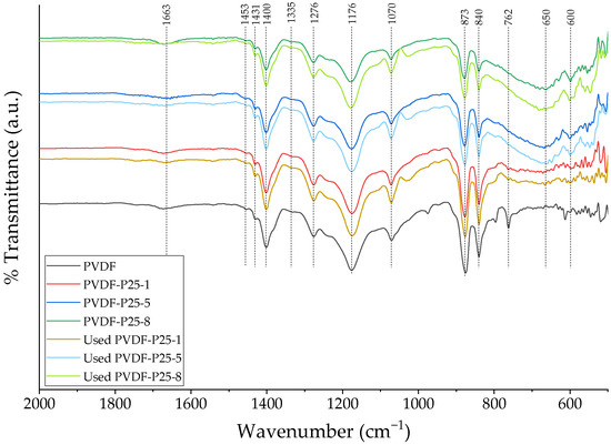 Figure 5 shows the Fourier transform infrared spectrometer (FTIR) data for the air-dried membranes, including the pristine PVDF membrane and PVDF/TiO2 membranes both before and after their use (24 h) in the photocatalytic filtration runs. A group of characteristic peaks confirmed the presence of the PVDF polymer in their α and β crystalline forms, which is in agreement with other studies from the literature [40,41]. In brief, a peak visible at 762 cm−1, which may be the result of CH2 in-plane bending or scissoring [42], is characteristic only of the α phase [43]. Likewise, a peak of 1276 cm−1 was reported to be present only in the β phase [41]. Specific peaks for the γ phase were not detected. Some other peaks present in the spectra of all the samples are attributed to different modes of vibration of CH2, CF2, and C-C groups in PVDF [41,42,43,44]. Spectra also display an additional peak at 1663 cm−1, which may be attributed to C=O groups in residual PVP [45]. Overlapping peaks in the 500–800 cm−1 range in PVDF/TiO2 samples are characteristics of Ti-O vibrations [46,47,48].