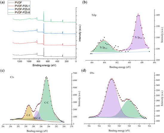 XPS (a) survey spectrum of membranes and high-resolution spectra of PVDF-P25-5 membrane for (b) Ti2p, (c) C1s, and (d) O1s regions.