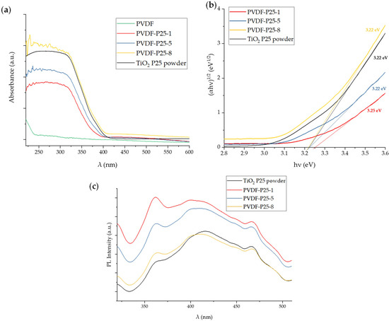 Figure 8c displays the PL spectra of the TiO2 P25 powder and PVDF-P25 membranes. A broad PL band centered at about 365 nm can be seen in all the materials. According to the discussion above, it can be associated with electron–hole recombination (i.e., the band–band PL process), while other peaks at energies lower than the band-gap energy (i.e., λ > 387 nm) are excitonic PL bands that could arise from TiO2 surface states [57]. The PL intensity at 365 nm of the PVDF-P25 samples higher than that of TiO2 P25 suggests that the entrapment of TiO2 P25 particles in the membrane accelerated the direct electron–hole recombination, which does not favor the photocatalytic activity. Nevertheless, increasing the TiO2 loading in the PVDF membrane led to a decreased PL intensity and, therefore, an enhanced charge separation.