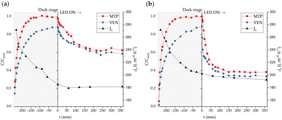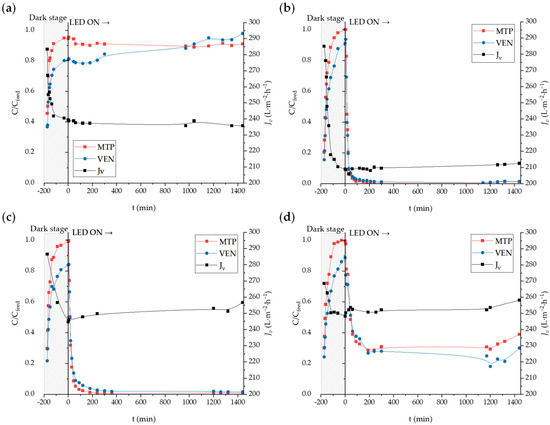 Filtration experiments were also conducted with a solution of MTP and VEN (initial concentration of 250 µg·L−1) in UP. Each run consisted of two stages. Firstly, a dark stage of 3 h in the absence of radiation (LED off) to allow for MPs to be adsorbed on the membrane to an extent close to equilibrium. Then, a radiation stage of 24 h (LED on) to allow for the photocatalytic removal of MPs. The concentration of MPs and the permeate flux (Jv) were measured over time. A steady-state permeate flux (Jvss) was observed in all the experiments. To compare the performance of the different membranes, a mass removal rate parameter (MRR, mg·m−2·h−1) was calculated according to Equation (1):