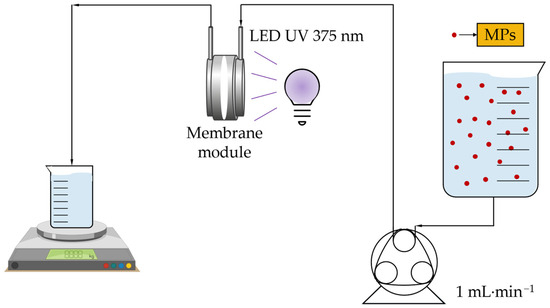 The experimental setup used to evaluate the capability of the synthesized membranes to remove specific MPs (i.e., VEN and MTP) in water is illustrated in Figure 12 [27]. The setup included a 10 W LED (peak emission wavelength of 375 nm according to the manufacturer). It was placed next to the membrane module wall, separated 24 mm from the membrane itself. The light emission for characterization purposes was evaluated using an Ocean Optics USB2000+ Fiber Optic Spectrometer (Orlando, FL, USA). The irradiance was measured, giving a value of 4.23 W·m−2. In addition, the maximum wavelength of the emitted radiation was measured to be 375 nm.