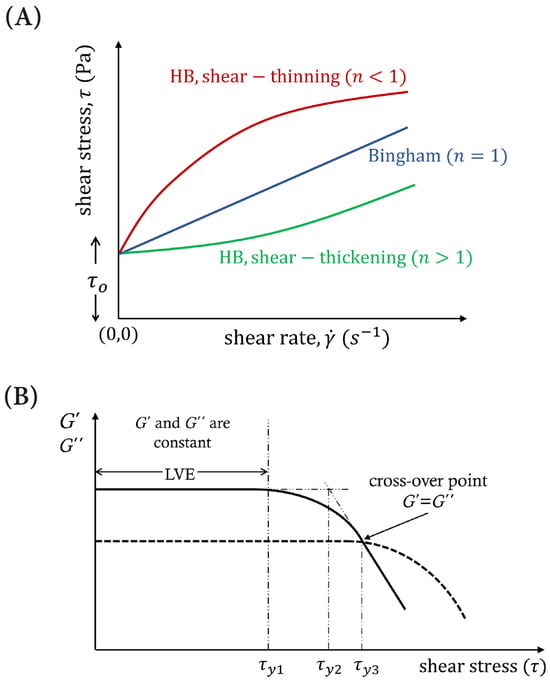 where τ represents the shear stress, τo represents the yield stress, k represents the consistency index, represents the shear rate, and n represents the power law exponent. For n < 1, the material is shear thinning, while for n > 1, the material is shear thickening (viscosity increases with increasing shear rate). When n = 1, Equation (1) is referred to as the Bingham model and k is the plastic viscosity. In fact, Bingham introduced the yield stress concept based on plastic yielding in metals [37]. A schematic representation of the HB model is shown in Figure 1A. Also, for το = 0 in Equation (1), the model is usually referred to as power law [43].