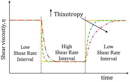 Schematic representation of the three-interval thixotropy test (3iTT) for shear viscosity. As the degree of thixotropy of the ink increases, the time required for structural recovery increases. Reproduced from Amorim et al. [28].