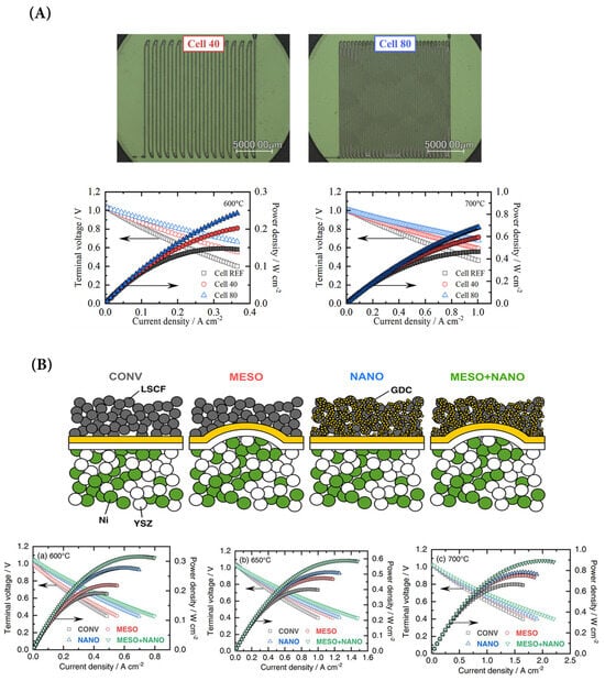 Patterned cells based on NiO nanopowder mixed with yttria stabilized zirconia (YSZ) to fabricate an anode-supported fuel cell and their respective electrochemical performances at 600 oC and 700 oC (A) [59]; structural modification techniques introducing gadolinium-doped ceria (GDC) nanoparticles into a meso-porous lanthanum strontium cobalt ferrite (LSCF) cathode and their respective electrochemical performances at 600 oC, 650 oC and 700 oC (B) [129].