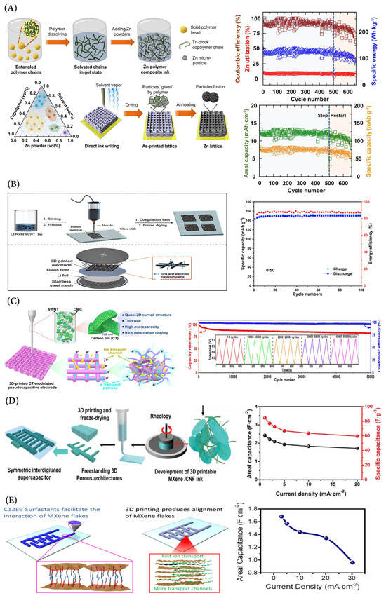 Taking into consideration that most of the as-tested printable inks for Li-based batteries include non-electrode materials and complicated formulation procedures that may cause undesired phenomena such as nozzle clogging, which certainly affect electrode electrochemical performance, Ao et al. [53] studied and developed a number of clog-free printable electrode inks for Li-ion batteries. In detail, they proposed an approach with multiple ball-milled processes, synthesizing 3D-printable inks that can be used for very long printing processes, leading to excellent printability and rheological characteristics, as well as a lack of any nozzle blockage phenomena. Specifically, they directly printed the anode and cathode on copper and aluminum current collectors, respectively. The as-fabricated electrodes exhibited average discharge capacities of 158.3, 145.8, and 147.4 mAh g−1 in 100 cycles for Li4Ti5O12 (LTO), LiNi0.815Co0.15Al0.035O2 (NCA), and LiFePO4- catalyst-based half-cells. Figure 4B indicates the structure and the specific capacity of a 3D-printed helical NCA cathode and an LTO anode at 0.3C. The initial discharge capacity was 145 mAh g−1 with 94.24% coulombic efficiency. A capacity retention of 87.6% was observed after 50 cycles. Also, in this study, two different kinds of carbon-based materials with the combination of two different polymers were blended to acquire a printable ink. In detail, graphite was mixed with multiwalled carbon nanotubes and PVDF with N-methyl-2-pyrrolidone (NMP).
