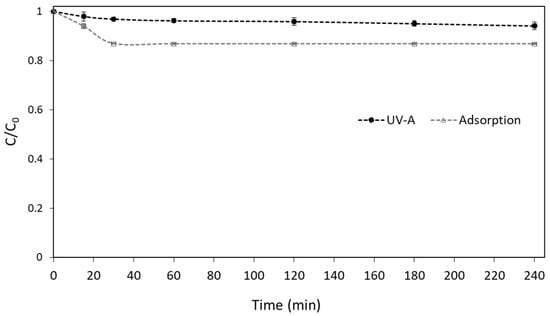 Before the evaluation of the performance of the UV-A/g-C3N4 process to degrade boscalid from the water, control experiments were conducted. The results from the adsorption and photolysis experiments, as depicted in Figure 1, prove that both processes cannot significantly remove the studied contaminant under the adopted experimental conditions.