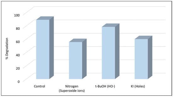 The contribution of HO● and h+ to the degradation mechanism was evaluated using t-BuOH (0.1 mol L−1) and KI (0.1 mol L−1), respectively [42,55]. The role of superoxide anion radicals (O2●−) was studied in an experiment conducted under N2 atmosphere [55].