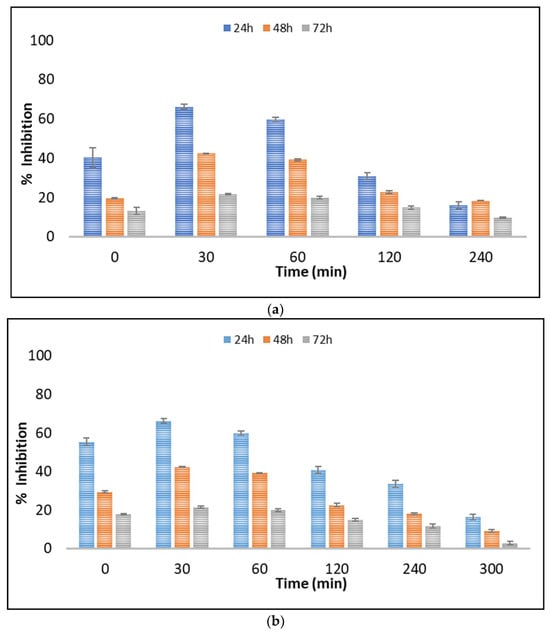 Control tests (UPW–g-C3N4 irradiated solutions, LW–g-C3N4 irradiated solutions) were also performed and showed a negligible to slight toxicity (~4–14% of inhibition) to Scenedesmus rubescens after 24, 48, and 72 h. Thus, concerns regarding the toxicity of nanoparticles can be excluded. The LW water was also found to provoke approximately 13.2% inhibition. According to the results depicted in Figure 5, a significant effect of 5% v/v untreated solutions of boscalid was observed during the first 24 h, reaching approximately 40.5% and 55.5% inhibition of growth rate in UPW and LW, respectively. In contrast, significantly lower was the inhibition after exposure for 48 and 72 h. This phenomenon is correlated with the microalgal adaptation mechanism after exposure to toxic compounds [51]. This trend was also observed at the first stages of the process (30 and 60 min in UPW and 30, 60, 120, and 240 min in LW), where the toxicity levels increased, probably due to the formation of the identified TPs.