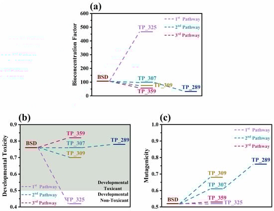 (a) Bioconcentration factors, (b) developmental toxicity, and (c) mutagenicity values of boscalid (BSD) and its TPs predicted by T.E.S.T. v5.1.2.