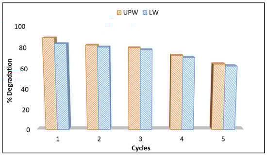 The reusability of the photocatalyst is a very important issue and is related to the catalyst’s ability to remain active after its use. Thus, to evaluate the reusability of the g-C3N4 catalyst against the degradation of boscalid, experiments were conducted for five cycles (Figure 7), adopting the same experimental conditions. After each cycle, the catalyst was recovered, rinsed several times with ultrapure water, and dried at room temperature. It was observed that the efficiency of the g-C3N4 catalyst was nearly the same, even after three cycles using both UPW and LW, demonstrating that the g-C3N4 catalyst can be recovered and reused, retaining its photochemical stability and activity. The performance appeared to slightly decrease when it was repeated another two times. These results indicate that g-C3N4-based photocatalysis can be an alternative and sustainable option for the treatment of aqueous matrices contaminated with boscalid fungicide because it can reduce both operating and disposal costs by the reusability of the catalyst. Such recycling is in line with Green Chemistry principles, particularly concerning preventing waste.