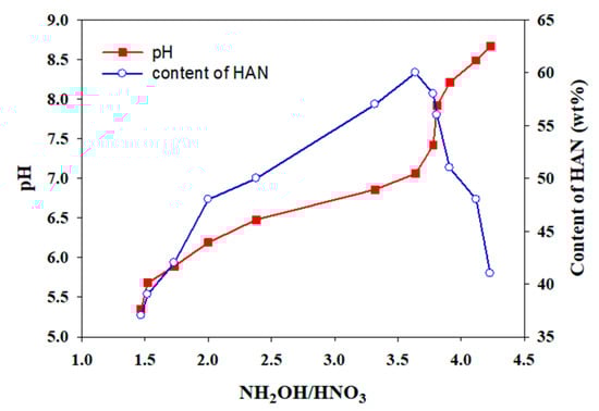 Figure 1 shows the effects of the hydroxylamine/nitric acid ratio on the pH and content of HAN in the HAN synthesis process as high-density nitric acid was added to hydroxylamine. In the initial stage, the pH of hydroxylamine was 9 and that of the nitric acid used in the synthesis was 1. Hence, as the quantity of nitric acid increased, the quantity of nitrogen ions in the nitric acid increased, whereas the pH of the HAN in the aqueous phase decreased. In general, synthesized HAN can generate hydroxylamine and nitric acid in a reversible reaction that proceeds according to Equation (10).