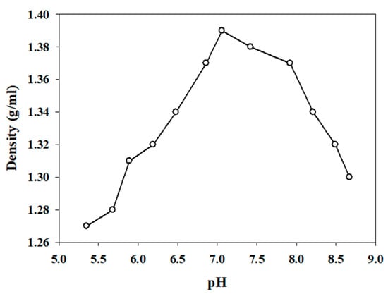 Figure 1 shows the concentration of HAN crystallized in an application of Equation (11). The effects of the pH in the HAN synthesis process on the density of the HAN solution are shown in Figure 2. The concentration of HAN and the density of the sample obtained at pH 5.35 were 37% and 1.27 g/mL, respectively. As the pH increased, the concentration and density increased up to pH 7.06, at which point the concentration and density started to decrease (Figure 1 and Figure 2, respectively). Finally, the concentration and density in the aqueous HAN solution showed the corresponding maximum values at an acidic pH of 7.06; the corresponding values were 60% and 1.39 g/mL.