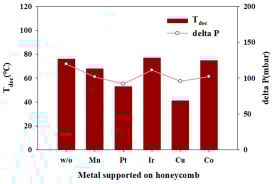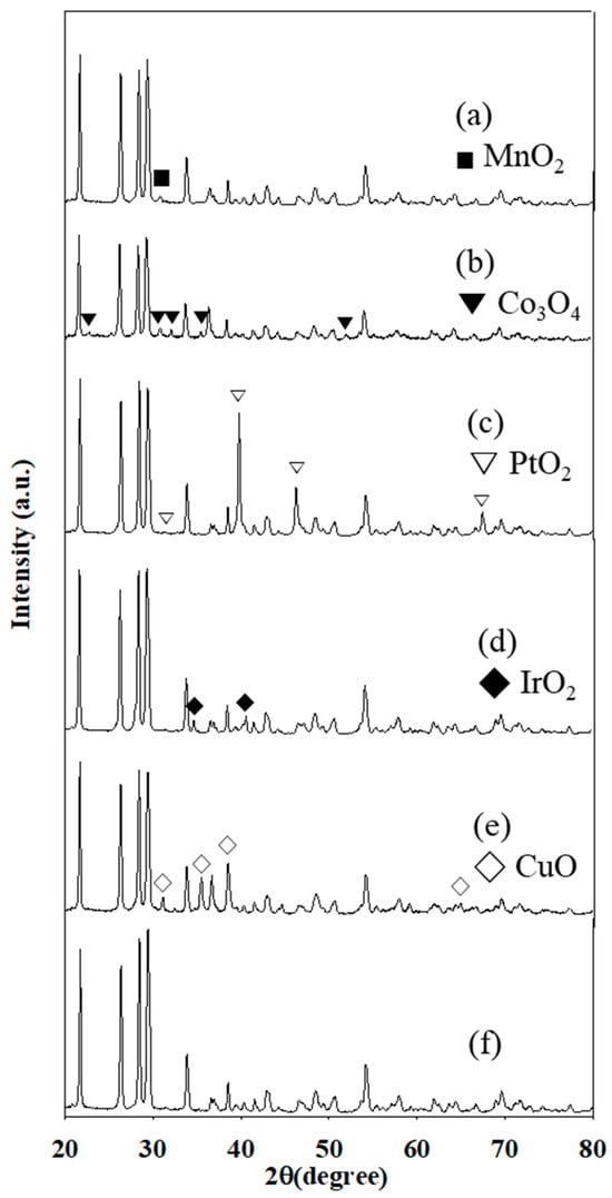 Figure 8 shows the results of an X-ray diffraction (XRD) analysis of catalysts on which Mn, Co, Cu, Pt, or Ir metallic oxides were impregnated on the honeycomb. In view of the XRD patterns of the honeycomb support that consisted of MgO-SiO2-Al2O3, it is clear that Mn, Co, Cu, Pt, or Ir metallic oxides were impregnated on the surface of the honeycomb support. The quantities of metals impregnated on the honeycomb support were analyzed by means of X-ray fluorescence (XRF), which showed that amounts in the range of 13.5–17.8 wt% of Mn, Co, Cu, Pt, or Ir elements were impregnated (Table 2).