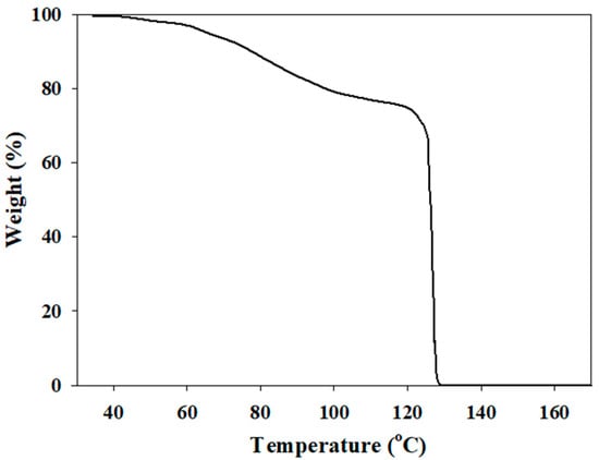 The thermogravimetric analyzer (TGA) thermogram of the HAN solution is shown in Figure 9. The broad endothermic curve up to 120 °C is attributed to the evaporation of water in the aqueous HAN solution. The corresponding weight loss observed in the TG curve is in good agreement with the water content in the HAN solution, as evaluated via density measurements. The aqueous HAN solution (80%) was found to decompose at approximately 124 °C.