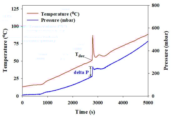 Figure 10 shows representative examples of an aqueous HAN solution decomposition by means of the Pt/honeycomb catalysts. This figure indicates the points of inflection that result from intense heat generation at around 52.9 °C. At such points, intense heat caused the catalyst temperature to increase drastically. The point at which the temperature increases is called the decomposition onset temperature (Tdec). As gases are also generated as a result of the intense heat at such points, a drastic pressure increase also occurs. The difference between the pressure right before decomposition and the maximum pressure is expressed as ∆P. The temperature of decomposition initiation was low in this case, indicating that the low-temperature decomposition of the catalyst was excellent. The larger the value of ΔP, the better the decomposition performance of the propellant of the catalyst, which is advantageous for the implementation of the specific impulse of the thruster.