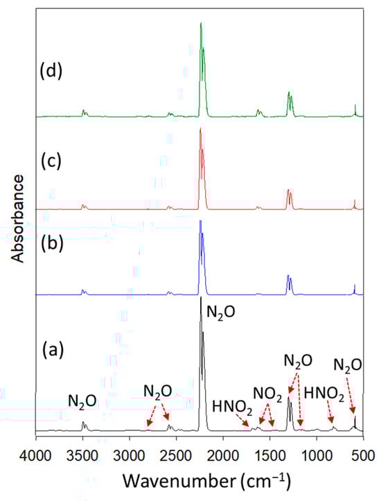 The product gases collected from the catalytic decomposition of the HAN solution over the catalysts were analyzed using an infrared spectrometer. As shown in Figure 12, Fourier-transform infrared spectroscopy (FT-IR) absorbance bands associated with HNO2, N2O and NO2 were observed [,,]. These species are intermediates included in the thermal decomposition pathways (Equations (2)–(9)) of the aqueous HAN solution, as suggested in a previous report []. The FT-IR absorbance bands obtained from the catalytic decomposition reaction were similar to those obtained from the thermal decomposition process and were not significantly affected by the type of catalyst used. This means that the effect of the catalyst on the decomposition mechanism of the aqueous HAN solution was negligible.