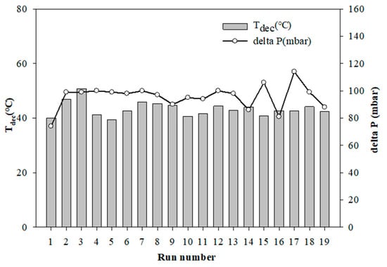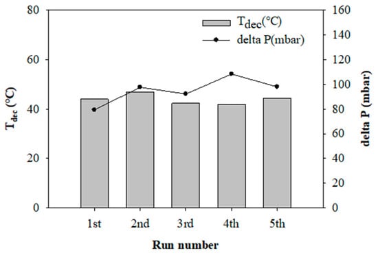 Decomposition onset temperature (Tdec) and ∆P in repeated decomposition of the HAN solution over the Cu/honeycomb catalyst (thermal shock was applied to the catalyst between each run).
