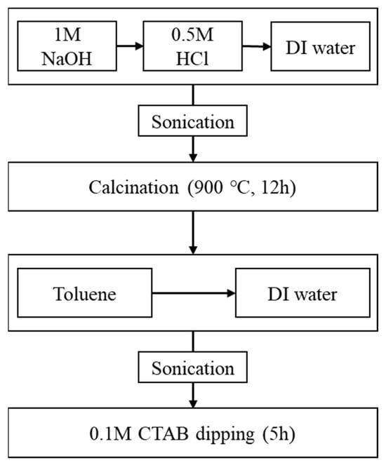 The honeycomb supports used here were purchased from Ceracomp Co. Ltd (Cheonan, Korea). The chosen material was cordierite (MgO-SiO2-Al2O3) and the monolith displayed 18 × 18 square channels with internal side lengths of one inch. As shown in Figure 15, impurities on the surface were removed by means of alkali, acid, and organic solvents as well as surfactants in order to facilitate the coating of metallic oxide on the honeycomb surface []. The honeycomb (1 cm in length and 1 cm in diameter) was immersed in a 1 M sodium hydroxide solution (NaOH, Sigma-Aldrich, Louis, MO, USA, 98%) and an ultrasonic wave treatment was applied for 15 min. The honeycomb was then immersed in a 0.5M hydrochloric acid solution (HCl, Sigma-Aldrich, Louis, MO, USA, 35~37%), after which another ultrasonic wave (Jeio Tech, Daejeon, Korea) treatment was conducted for 15 min. This honeycomb was calcined under an air atmosphere at 900 °C for 12 h. The calcined honeycomb was immersed in toluene for sonication, dried in an oven at 100 °C, and then washed with distilled water. Moisture in the honeycomb was dried in the oven (Jeio Tech, Daejeon, Korea) at 100 °C and then dipped in hexadecyltrimethylammonium bromide (CTABr, Sigma-Aldrich, Louis, MO, USA, >98%) for five hours.