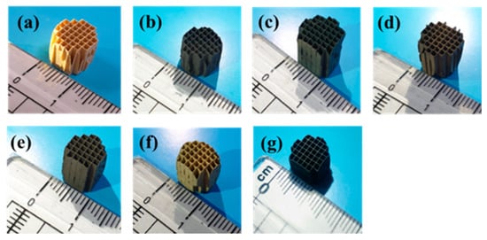 Metal oxide catalysts supported on honeycomb. (a) Cordierite honeycomb; (b) Cu; (c) Co; (d) Mn; (e) Pt; (f) Ir; (g) Pd.