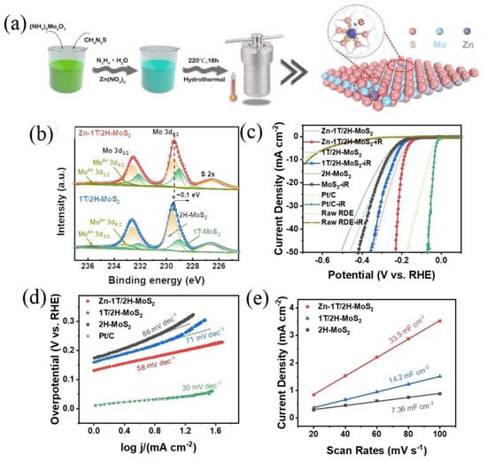 - Xu, J.; Zhao, Z.; Wei, W.; Chang, G.; Xie, Z.; Guo, W.; Liu, D.; Qu, D.; Tang, H.; Li, J. Tuning the Intrinsic Activity and Electrochemical Surface Area of MoS2 via Tiny Zn Doping: Toward an Efficient Hydrogen Evolution Reaction (HER) Catalyst. Chem. Eur. J. 2021, 27, 15992–15999. [Google Scholar] [CrossRef] [PubMed]