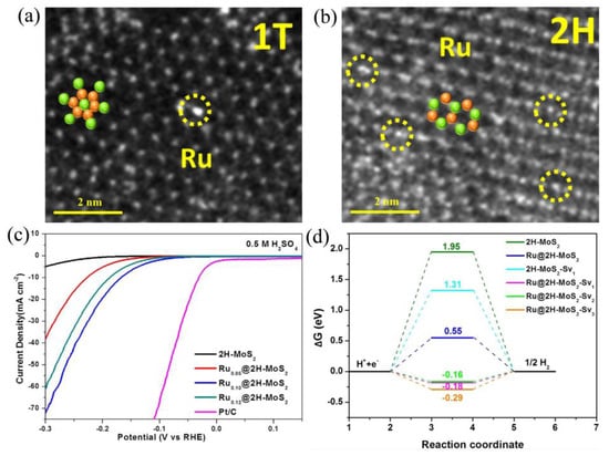 - Zhang, J.; Xu, X.; Yang, L.; Cheng, D.; Cao, D. Single-Atom Ru Doping Induced Phase Transition of MoS2 and S Vacancy for Hydrogen Evolution Reaction. Small Methods 2019, 3, 1900653. [Google Scholar] [CrossRef]