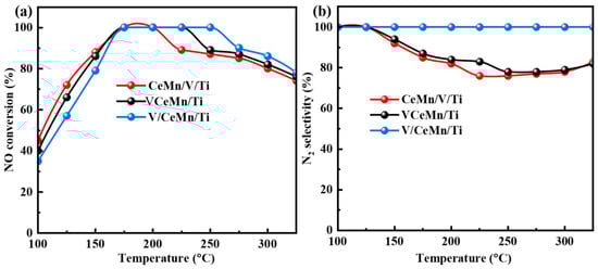 Figure 1a displays the results for the activity of various catalysts. The NO conversion decreased in the sequence of CeMn/V/Ti > V/CeMn/Ti > VCeMn/Ti at temperatures between 100 and 175 °C. This suggested that at low temperatures, the Ce (Mn) exposed on the outer surface of the catalysts was the dominant active species. Nevertheless, as the reaction temperature increased, the NO conversion was increased with respect to that of V/CeMn/Ti, and there was >90% NO conversion over a broad temperature range of 175–325 °C. With the further increase in the reaction temperature, the NO conversion slightly decreased because of the partial oxidation of NH3 []. Moreover, the NO conversion of the V/CeMn/Ti catalyst was higher than that of the CeMn/V/Ti and VCeMn/Ti catalysts at 175–325 °C, which indicated the synergistic effect between V and Ce (Mn). In summary, the V/CeMn/Ti catalysts had better NO conversion over the entire temperature range, which may have been associated with the good dispersion and reducibility of the active species of V exposed on the outer surface of the catalyst at medium and high temperatures.