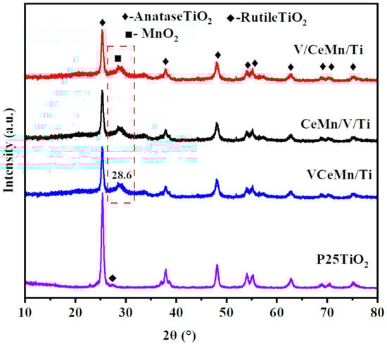 The crystal structure of the catalysts was the subject of X-ray diffraction measurements, as shown in Figure 3. It was evident that the catalysts had similar 2θ diffraction locations but with various diffraction strengths. The diffraction peaks of 2θ at 25.2°, 37.6°, 48.2°, 52.9°, 55.3°, 62.6°, 68.7°, 70.4°, and 75.1° corresponded to the (101), (004), (200), (105), (211), (204), (116), (220), and (215) anatase TiO2 facets, respectively []; the diffraction peaks of 2θ at 27.5°corresponded to the rutile TiO2, and the diffraction peaks of the three catalysts at 2θ = 28.5° were the typical diffraction peaks of MnO2. The Scherrer equation was used to calculate the particle size of MnO2, and the particle sizes of MnO2 in the VCeMn/Ti, CeMn/V/Ti, and V/CeMn/Ti catalysts were 13.1472, 13.1480, and 13.1483 nm. The VCeMn/Ti catalyst had the smallest particle size, which indicated that the particles were reduced and the relative surface area was increased, which was in accordance with the conclusions from BET (Figure S1). No distinct diffraction peaks corresponding to the oxides of V and Ce were observed in the catalysts, which suggested that the doped metal oxides were present in an altitudinally dispersed state, which facilitated mutual contact with the activated ingredients and was conducive to strong reactions between the metal oxides []. SEM was used to observe the morphology of the catalysts, as shown in Figure S2. The morphologies of the three catalysts were similar, consisting of nanoparticles of varying sizes []. The results showed that the morphology of the catalysts was not affected by the order in which the active ingredients were loaded. The relevant BET surface areas and pore size distributions are summarized in Table 1; the catalysts exhibited “IV” adsorption–desorption isotherms with H3-type hysteresis loops, and their pore sizes were predominantly distributed between 2 and 50 nm, suggesting that the catalysts were formed from mesoporous structures [,]. The BET surface area declined in the order of V/CeMn/Ti ≈ CeMn/V/Ti > VCeMn/Ti, and the specific surface area of the catalysts that were synthetized through step-impregnation was larger than that of the catalysts that were synthetized through one-step impregnation. This could be attributed to the aggregation of MnO2 on the VCeMn/Ti catalyst during its preparation, leading to a reduction in its specific surface area (Figure S1).
