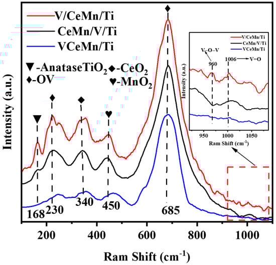 The structural characteristics of V and Ce were studied with Raman spectroscopy. As shown in Figure 4, the weakly adsorbed peak at about 168 cm−1 was attributed to the B1g mode of anatase TiO2 [,]. No TiO2 peaks were detected for the VCeMn/Ti catalysts because of the presence of more of the MnO2 crystal phase on the surface, resulting in a weakening of its peak intensity. The results were consistent with those of XRD, and a prominent peak was centered at 450 cm−1, which suggested that CeO2 was present in the form of microcrystals [,], though this was undetectable in the XRD analysis. The peaks at 230 and 685 cm−1 were attributed to oxygen vacancies because of the presence of Ce3+ [,]. Oxygen vacancies enhance oxygen uptake and improve the efficiency of conversion between Ce3+ and Ce4+ []. Moreover, the strongest peak strengths were found for the V/CeMn/Ti catalysts, suggesting the presence of more oxygen vacancies that would promote NO oxidation and further facilitate the NH3-SCR reaction []. The peak at 1005 cm−1 was attributed to the monomeric V species. The peak at 960 cm−1 was attributed to the polymeric V species; according to the literature [], the polymeric state of vanadium exhibits significantly higher activity than that of its monomeric state. Interestingly, the band at 960 cm–1 was the strongest for the V/CeMn/Ti catalyst, indicating that the V/CeMn/Ti catalyst had the best SCR performance, which was consistent with the results for the activity.