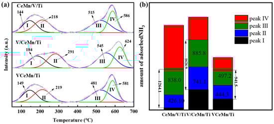 A catalyst’s surface acidity can influence the adsorption of NH3 and further impact the catalytic reaction. Figure 5a displays the NH3-TPD results. All catalysts were fitted into four desorption peaks in the range of 100–700 °C. The four peaks were the physical adsorption peak (at 100–150 °C; corresponding peak I) and the peaks of NH3 desorption on weak acids (Aw: 150–350 °C; corresponding peak II), medium-strong acids (Am: 400–550 °C; corresponding peak III), and strong acids (As: 550–700 °C; corresponding peak IV) [,]. Previous studies have reported [,] that NH4+ ions adsorbed at weak acid sites have lower thermal stability than that of NH3 adsorbed at strong acid sites. The peaks of desorption at lower temperatures were caused by the desorption of NH3 from the weak acid sites, and the peaks at higher temperatures were due to the desorption of NH3 from strong acid sites. Figure 5b displays the number of distinct acid sites. The analysis of the peak areas showed that the VCeMn/Ti catalyst had the smallest amount of acid compared to the other catalysts. However, the V/CeMn/Ti catalysts had a greater amount of acid—especially weak acids—than the CeMn/V/Ti and VCeMn/Ti catalysts. Therefore, the acidity of the catalyst was increased when the active component V was exposed to the outer surface of the catalyst.