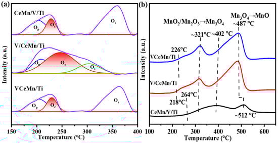 The O2-TPD of the catalysts is shown in Figure 6a. Three O2 desorption peaks were observed in the range of 100–400 °C, and they were attributed to physically adsorbed oxygen (Op, around 200 °C), chemically adsorbed oxygen (Oc, around 250 °C), and lattice oxygen (surface lattice oxygen Os), respectively. The V/CeMn/Ti catalyst had the smallest adsorption capacity for Os, indicating that it had more oxygen vacancies, which led to more chemisorbed oxygen and was consistent with it having more Oc, which helped to upgrade its catalytic properties. The desorption peaks of the VCeMn/Ti catalyst were weaker, suggesting that it had a poorer capacity for storing oxygen. The area of the Oc peaks of the V/CeMn/Ti catalyst was much larger than those of the CeMn/V/Ti and VCeMn/Ti catalysts, which indicated that the oxygen storage capacity of the V/CeMn/Ti catalysts was much larger than that of the CeMn/V/Ti and VCeMn/Ti catalysts, and the exposure of active V species to the outer surface of the catalysts significantly increased the oxygen storage capacity, which was consistent with the Raman results.