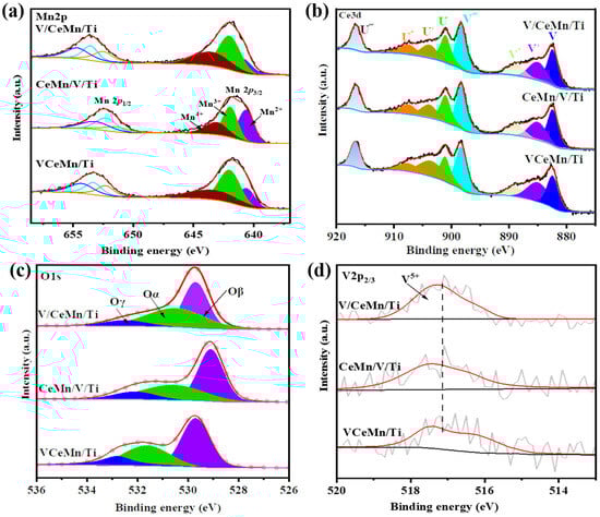 X-ray photoelectron spectroscopy (XPS) was used to study the chemical state of the surface elements of the catalysts. Figure 7 reveals the XPS spectra of Mn 2p, Ce 3d, O 1s, and V 2p, and the percentages are shown in Table 2. Figure 7a exhibits two dominant peaks of Mn 2p3/2 and Mn 2p1/2 at 633 eV and 665 eV. The Mn 2p3/2 spectrum was segmented into three distinctive peaks, which were assigned to Mn2+ (~640.7 eV), Mn3+ (~641.6V), and Mn4+ (~643.6 eV) [,]. Table 2 shows that the ratio of Mn4+/Mn2+ was significantly higher in V/CeMn/Ti (42.7%) than in CeMn/V/Ti (25.3%) and VCeMn/Ti (29.6%). Manganese oxide species with a higher valence state exhibited greater redox activity on Mn-based catalysts []. Furthermore, Mn4+ was shown to expedite the conversion of NO into NO2 and enhance the SCR reaction via the “fast SCR” pathway, which was in agreement with the catalytic performance of the catalysts.