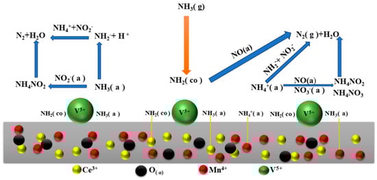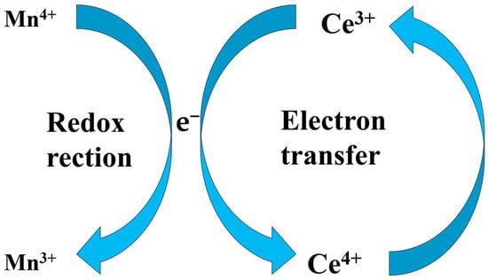 On the basis of the analysis of the above characterization results, a possible redox cycle on the V/CeMn/Ti catalyst was proposed. As shown in Figure 8, in the primary impregnation products of CeMn/Ti, there was a redox cycle in the form of Mn4+ + Ce3+↔Mn3+ + Ce4+. The coexistence of Ce3+ and Ce4+ species was shown to generate charge imbalances, oxygen vacancies, and unsaturated chemical bonds at the catalyst surface, and it facilitated the formation of chemisorbed oxygen on the catalyst surface [,]. The exposure of V to the outer surface of CeMn/Ti significantly improved the redox cycle and electron transfer, and it promoted NO/NH3 adsorption/activation.