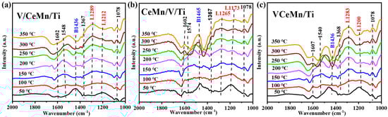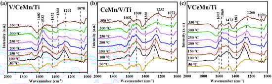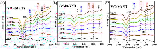 In situ DRIFTS was conducted on three catalysts to elucidate their excellent performance. As shown in Figure 9, the peak located at ~1456 cm−1 was attributed to NH4+ ions adsorbed at the B-acid site. The peaks that emerged at ~1153 cm−1 and ~1293 cm−1 were assigned to NH3 species that were absorbed at the L-acid site []. The peaks observed at about ~1078 cm−1 and ~1530 cm−1 were assigned to NH2− species that were absorbed on the L-acid site and NH2 coordinate to the L-acid []. According to these results, L-acid and B-acid coexisted in the catalysts. Upon contrasting the peak intensities of all catalysts, it was discovered that the strongest peak intensities were those of NH4+ and NH3 species absorbed on the B-acid sites and L-acid sites in the V/CeMn/Ti catalyst, which implied that the V/CeMn/Ti catalyst had the strongest acidic sites when V was exposed to the outer surface of the catalyst, and this was consistent with the results for the activity.