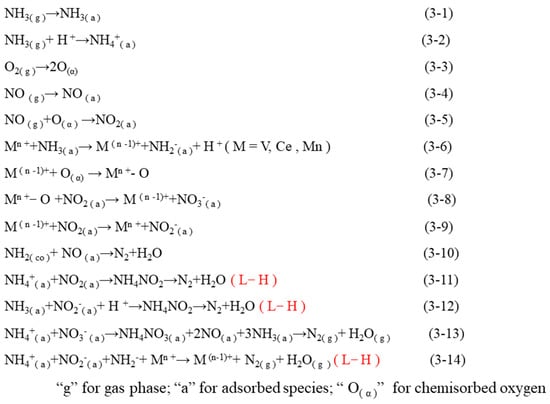 Model of the reaction mechanism (L-H) for different components of the V/CeMn/Ti catalytic system.