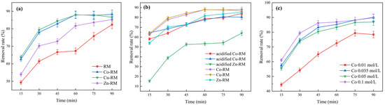 We first investigated the preparation process of the red mud-based catalyst, which included the choice of transition metal, the acidification, and the concentration of the transition medal. By loading RM with three different metals, Co, Cu, and Zn, the effects of pristine red mud and catalysts loaded with different types of metals on the removal rate of tetracycline were investigated. As shown in Figure 1a, the removal rate of tetracycline was similar between the Co-RM/PDS system and the Cu-RM/PDS system with a reaction time of 0–75 min. At a reaction time of 90 min, the removal rates of tetracycline in the Co-RM/PDS system and the Cu-RM/PDS system were 88.3% and 86.6%, respectively, indicating that the Co-RM catalyst has a better effect on activating PDS for the removal of tetracycline. The reason for this phenomenon could be the continuous self-cycling of Co2+ during the catalytic reaction process, which completes the activation of persulfate [14]. Therefore, among the RM catalysts prepared by the loading of transition metal elements, the effect of activating PDS with red mud loaded with cobalt is the best. Therefore, the Co-RM catalyst was selected to activate PDS to remove tetracycline.