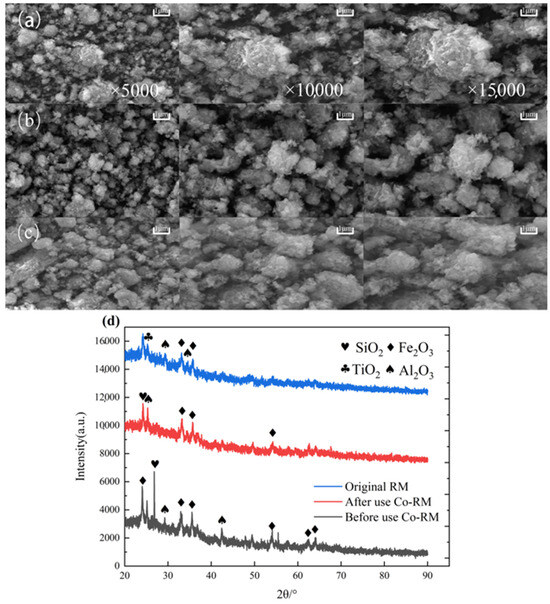 Scanning electron microscopy of the original red mud and Co-loaded red mud before and after use (a) original red mud (b) Co-RM before use (c) Co-RM after use. (d) XRD patterns of RM before and after using Co-RM, Original RM, Co RM, and Co RM after utilization of RM.