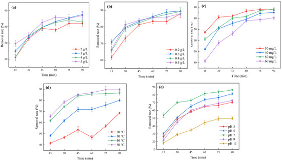 We optimized the experimental conditions for the degradation of tetracycline using the Co-RM/PDS system. From Figure 3a, it can be seen that at a PDS dosage of 2 g/L to 5 g/L, the removal rate of tetracycline in the Co-RM/PDS system is positively correlated with the PDS dosage. When the reaction time was between 75 and 90 min, and the PDS dose was increased from 2 g/L to 3 g/L, the removal rate of tetracycline in the Co-RM/PDS system increased by 5.6%. With a reaction time of 90 min, the removal rate of tetracycline in the Co-RM/PDS system was 87.6% at a PDS dosage of 3 g/L. As the PDS dose further increased to 4 g/L and 5 g/L, the efficiency of tetracycline removal in the Co-RM/PDS system decreased by 4.6% and 0.7%, respectively. The reason for this phenomenon could be that the Co-RM/PDS system generates more active radicals such as SO4−·, ·OH, etc., with an increasing PDS dosage. These active radicals promote the removal of tetracycline, thereby improving the removal rate of tetracycline. As the PDS dosage is increased, the active free radicals generated by the Co-RM catalyst in the solution increase and quenching reactions occur between the generated free radicals, resulting in some PDS being consumed, but no effective free radicals are generated, thereby reducing the active free radical removal rate of tetracycline in the Co-RM/PDS system.