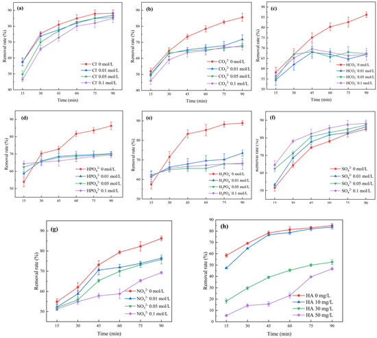 Effects of anions and natural organic matter in water on the removal rate of tetracycline in the Co-RM/PDS reaction system: (a) Cl−; (b) CO32−; (c) HCO3−; (d) HPO42−; (e) H2PO4−; (f) SO42−; (g) NO32−; (h) HA; on the removal rate of tetracycline in the Co-RM/PDS reaction system.