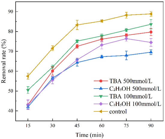 In Figure 5, it can be seen that the removal rate of tetracycline in the Co-RM/PDS system increases continuously with time when the added TBA concentration is 100 mmol/L. After 90 min of reaction time, the removal rate of tetracycline was 83.6%. When 500 mmol/L TBA was added to the reaction system, the removal rate of tetracycline in the Co-RM/PDS system decreased to 79.7%. The decrease in removal rate by the addition of TBA indicated that ·OH is involved in the degradation process. After adding 100 mmol/L and 500 mmol/L anhydrous ethanol, the removal rates of tetracycline in the Co-RM/PDS system were only 74.5% and 69.6%, respectively, after 90 min of reaction time, where the inhibition rate of anhydrous ethanol is higher than that of TBA. Since anhydrous ethanol is a scavenger for SO4−· and ·OH, while TBA can selectively scavenge ·OH, we deduced that both SO4−· and ·OH are involved in the degradation of tetracycline in the Co-RM/PDS catalytic system.