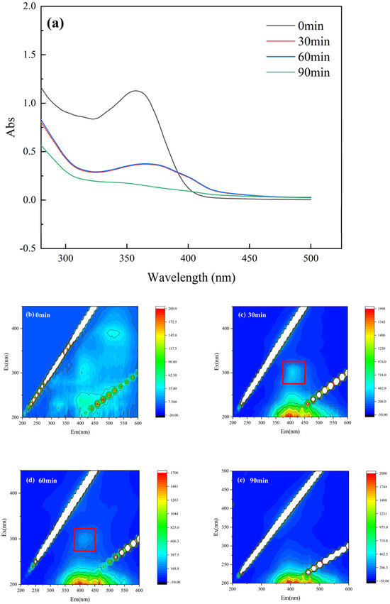 The three-dimensional fluorescence spectrum of tetracycline before and after degradation; (a) react 0 min (b) react 30 min (c) react 60 min (d) react 90 min. UV-Vis scanning spectral changes during the process of tetracycline degradation (e). (The red rectangle was used to emphasize the new fluorescence peak domain).