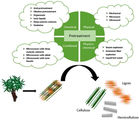 The initial processing of biomass usually consists of the fractionation of the polymers. Therefore, the first step of biomass processing aims to isolate the biomass fractions and increase the cellulose susceptibility in order to consequently facilitate its depolymerisation and solubilisation [12]. This first step is realized by chemical or physical pre-treatments and/or combinations thereof, namely, e.g., mechanical, hydrothermal (steaming), chemical (hydrolysis), and biochemical (enzymatic saccharification) processes. The main pre-treatment methods are summarized in Figure 2.