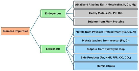 Exogenous impurities of biomass are mainly related to the presence of the catalysts used the initial hydrolysis step, to the application of physical pre-treatments to the raw biomass feedstock, and to the implementation of experimental reactor setups.